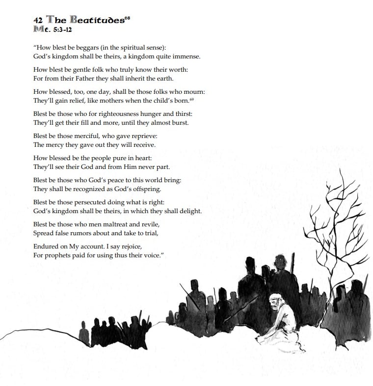 Experience the powerful teachings of Jesus in a new way through this rhyming epic poem. The illustrations depict the crowd gathered on the mountaintop, listening intently to Jesus' words of wisdom.